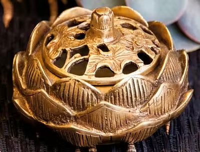Rökelsekärl Lotus Mycket dekorativt rökelsekärl som är tillverkat av massiv mässing med filigran gravyr. Det kan kan även användas utan sand och är ca 8,5 cm i diameter. Vikten är ca 450 g och den kostar 525 kr. Vi har många fler olika rökelsehållare för både koner och stickor även backflow.